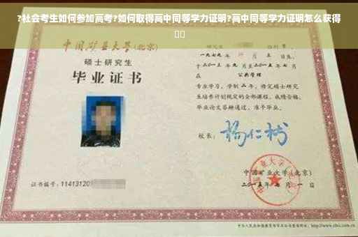 同等学历指具有与某级教育相同层次的学历或者获得同级教育但非同一学科、专业的毕 业 证书(包括相应的学位)。如:一般认为,我国中等专业学校或者职业高中的毕业生和普通高中毕业生具有同等学历。社会考生参加高 考流程1、亲自到县区高招办报名(一般为当地教育局)2、需要带上户口本、身 份 证以及同等学历证明(高中文 凭、中专文 凭或《学业水平测 试和格证》),履行填写手续。·在职干部和工人带学历证明及单位介绍信;·应安排工作而尚未安排的退伍、转业军人,须持(区)民 政 部门的证明一般是填写五种表:《报名登 记表》、《准考证》、《考生志愿表》、《考生志愿代码登 记表》及《考生卡片》,同等学历者还需填写《政 治思想品德考查表》。3、社会考生参加高 考跟普通高 考无区别, 区分文、理科4、报名时需上缴考 试费、《报考指导》费、体检费等全部费用。