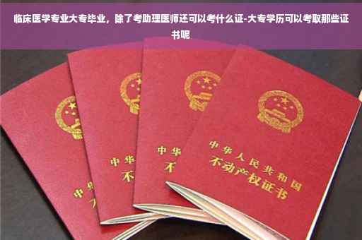临床医学专业大专毕业,一般都是考助理医师证,然后做相关的工作后在考医师资格证; 据《中华人民共和国执业医师法》及有关规定具有下列条件之一的,可以参加医师资格考试: (一)具有高等学校医学专业本科以上学历,在执业医师指导下,在医疗、预防、保健机构中试用期满一年的; (二)取得执业助理医师执业证书后,具有高等学校医学专科学历,在医疗、预防、保健机构中工作满二年;具有中等专业学校医学专业学历,在医疗、预防、保健机构中工作满五年的。 (三)具有高等学校医学专科学历或者中等专业学校医学专业学历,在执业医师指导下,在医疗、预防、保健机构中试用期满一年的,可以参加执业助理医师资格考试。 以师承方式学习传统医学满三年或者经多年实践医术确有专长的,经县级以上人民政府卫生行政部门确定的传统医学专业组织或者医疗、预防、保健机构考核合格并推荐,可以参加执业医师资格或者执业助理医师资格考试。考试的内容和办法由国务院卫生行政部门另行制定。