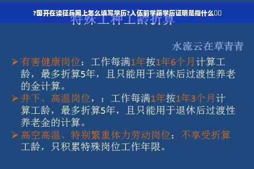 入伍前学籍学历证明是指的什么?入伍前学籍证明和学历证明指的是,如果你是在校大学生,那么在学校入伍,就己经证明了你的学籍,不用再开什么证明,因为有学校为你做担保,因为是在校大学生,还没有取得学历,所以国家要保留你的学籍,服役期满后返校完成学业,取得学历