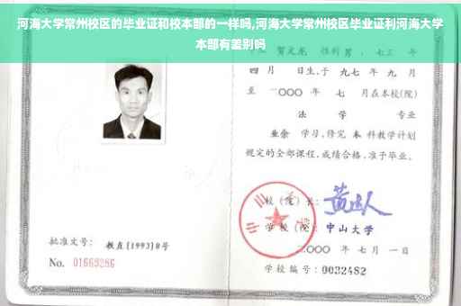 河海大学常州校区的毕业证与河海本部的毕业证没有区别。 因为河海大学常州校区是河海大学的分校,分校生的本科毕业证书由总校统一颁发,证书的封皮样式与文字与总校一模一样,发的都是河海大学的毕业证,没有常州校区字样。