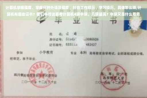你说的应该是计算机等级考试吧,那时教育部的考试,一般应该取得二级~~如果你是计算机专业的,考这个证书用处不大~~如果一定要考,你可以按你的专业考,考三级足够了~~四级基本没人考~一般企业要求的是二级.外企要求的一般最多三级~~三级有网络技术,数据库,PC技术等,你可以按自己的专业来考,但是你是计算机专业的.你应该考的证书:应该是:全国计算机软件专业技术水平与资格考试,这个证书是由人事部和信息产业部联合举办的,一般计算机专业的都要考这个证书~~他每年全国联考二次,他分三级,每个级别有五六个方向可以选择,~你可以试试看~~我也是计算机专业的。我考的就是软考得中级网络工程师~~~这个证书很好用~~希望你也可以考取~~ 国家计算机等级考试中,其中如果获得三级"PC技术"证书,表明持有人具有计算机应用的基础知识,掌握Pentium微处理器及PC计算机的工作原理,熟悉PC机常用外部设备的功能与结构,了解WINDOWS操作系统的基本原理,能使用汇编语言进行程序设计,具备从事机关、企事业单位PC机使用、管理、维护和应用开发的能力;三级"信息管理技术"证书,表明持有人具有计算机应用的基础知识,掌握软件工程、数据库的基本原理和方法,熟悉计算机信息系统项目的开发方法和技术,具备从事管理信息系统项目和办公自动化系统项目开发和维护的基本能力;三级"数据库技术"证书,表明持有人具有计算机应用的基础知识,掌握数据结构、操作系统的基本原理和技术,熟悉数据库技术和数据库应用系统项目开发的方法,具备从事数据库应用系统项目开发和维护的基本能力;三级"网络技术"证书,表明持有人具有计算机网络通信的基础知识,熟悉局域网、广域网的原理以及安全维护方法,掌握因特网(INTERNET)应用的基本技能,具备从事机关、企事业单位组网、管理以及开展信息网络化的能力。
