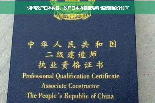 一,不困难的,只要符合相应的更改条件的,就可以申请更改。 二,户口本更改信需要的资料及流程: (一)《户口项目变更更正申请审批表》(原件1份); (二)居民身份证(复印件1份,验原件); (三)居民户口簿(复印件1份,验原件); (四)提供更正项目(包括主项人口信息:姓名、曾用名、民族、性别、出生日期、公民身份号码及户口迁入本市时间,非主项人口信息:住址、文化程度、婚姻状况、服务处所、职业、出生地、籍贯等)证明材料。(复印件1份,验原件); (1)人口信息主项更正审批和程序:申请人提供申请材料,由户口所在地派出所户籍民警受理,经调查核实后报分局人口科审核(其中对18周岁以下更正名字作出终审决定),分局人口科上报市局人口处审批,市局人口处接到上报材料后,由市局人口处作出终审决定,派出所通知申请人审批结果。 (2)人口信息非主项更正审批和程序:申请人提供申请材料,由户口所在地派出所户籍民警受理,经调查核实后作出终审决定。 主项更正人口信息自受理申请之日起40个工作日内(18周岁以下名字更正20个工作日)办结,非主项更正人口信息当场办结。