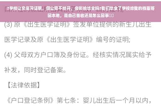 这个倒没有什么啊,不影响你毕业,我当时是毕业的时候,好像就是领毕业证那天我才拿着实习证明过去的,说是不给毕业证,但是当天还是会给的,你要领的话,他就给你,因为你档案缺少证明,到时候都是要封存的,就像你的高考准考证啊,还有你的实习证明什么都在里面,你大学的,你的各科的成绩什么的都在里边,因为当时这个东西是我自己打开往里放的,领毕业证的时候,有许多东西要处理,去领档案的时候就是问你领不领?如果你领,你签好字,她就把档案给你,你就可以带走了,档案你就要放到你们当地的人才市场,因为这个东西不能在手里放着,还有报到证,报到证有时间限制,都是一个月。