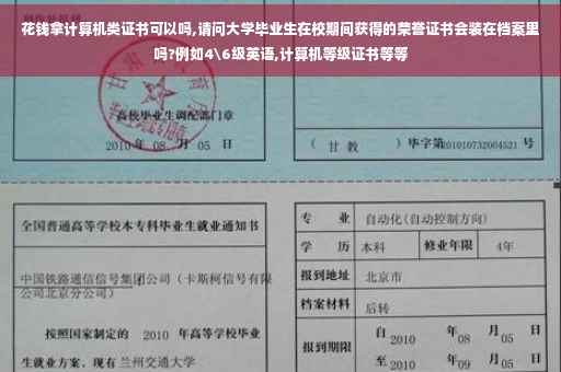 大学毕业生在校期间获得的荣誉证书会,例如4\6级英语,计算机等级证书等等.这些东东是国家认证的,当然会有记录的,当然不是把证书放在里面,放不下,但是里面有你的记录:如XX年,XX以XX分通过了国家英语四级等.