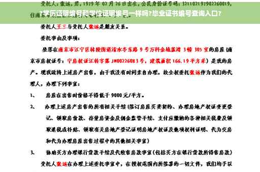 学历证书编号和学位证书编号是不一样的,因为学历证书和学位证书就不是一样东西。学历证书是学制系统内实施学历教育的学校或者其他教育机构,对完成了学制系统内一定教育阶段的学习任务的受教育者所颁发的文凭,是学业证书的主体之一,在数量上占学业证书的大部分。主要有小学毕业证书、中学毕业证书、高中毕业证书、中等专业学校毕业证书、大专毕业证书、本科毕业证书、硕士毕业证书、博士毕业证书等等。学位证书,又称学位证为了证明学生专业知识和技术水平而授予的证书,在我国学位证授予资格单位为通过教育部认可的高等院校或科学研究机构。 获得学位意味着被授予者的受教育程度和学术水平达到规定标准的学术称号, 经在高等学校或科学研究部门学习和研究,成绩达到有关规定,由有关部门授与并得到国家社会承认的专业知识学习资历。 比如你在一个大学修完该修的学分,所有成绩及格,你就可以拿到该学校的毕业证。但是学位证是在所有成绩的及格的基础上,有更高的要求。目前我国大部分学校都会要求学分绩点达到2.0(通常即加权平均分为70分)以上才能被授予学士学位,否则只能拿到毕业证。有些学校有特别要求,比如若出现考试作弊的行为,毕业时只能拿到毕业证,不能授予学士学位。