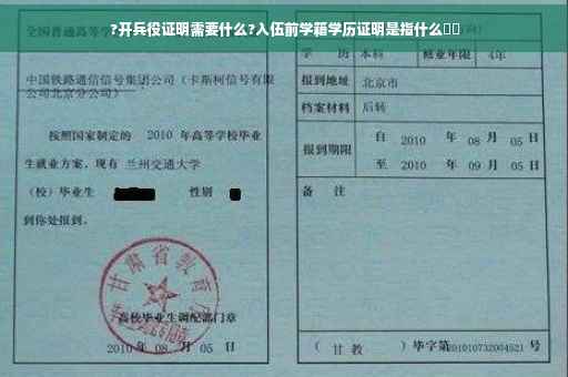 入伍前学籍学历证明是指的什么?入伍前学籍证明和学历证明指的是,如果你是在校大学生,那么在学校入伍,就己经证明了你的学籍,不用再开什么证明,因为有学校为你做担保,因为是在校大学生,还没有取得学历,所以国家要保留你的学籍,服役期满后返校完成学业,取得学历