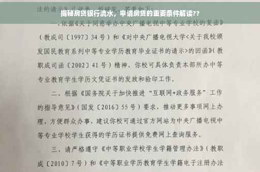 摘要:本文将揭秘房贷申请中的银行流水要点,解读作为申请房贷的重要条件之一。通过本文,读者将了解银行流水在房贷申请中的作用,包括如何准备和提供有效的银行流水证明。还将介绍申请房贷的其他必备条件,帮助申请人顺利获得贷款批准。