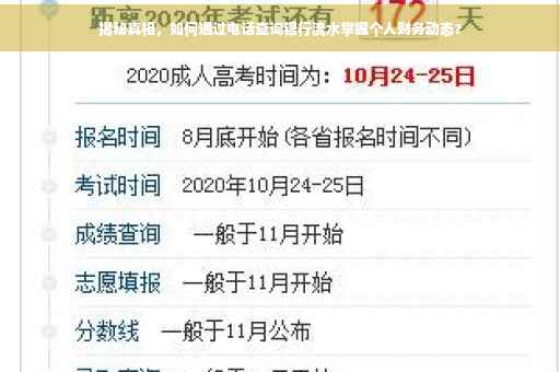摘要:本文将揭示电话查询银行流水的真相,帮助您轻松掌握个人财务动态。通过简单的电话操作,您可以方便地查询银行账户的收支明细,了解资金流动情况。本文将介绍电话查询的具体步骤、注意事项以及可能遇到的问题,让您在掌握个人财务动态的同时,保障资金安全。