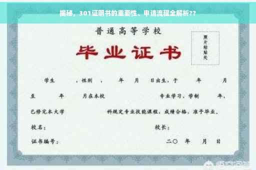 摘要:本文将为您揭秘301证明书的重要性及其申请流程。这份证明书具有极高的价值,是评估个人资质的重要依据之一。本文将详细解读申请流程,包括准备材料、提交申请、审核过程等环节,以帮助您顺利获得该证明书。阅读本文,您将全面了解301证明书的重要性及其申请流程,为您的未来发展助力。??(注:本文旨在提供一般性信息,具体申请流程可能因实际情况而有所不同。)