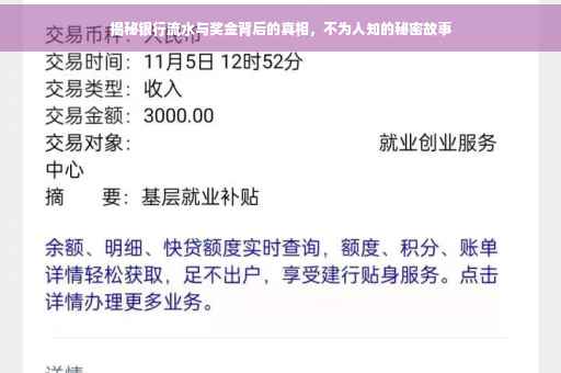 摘要:本文将揭示银行流水与奖金背后的秘密真相,带你了解看似普通的银行流水记录背后隐藏的故事。通过深入剖析银行流水账单的细节,揭示奖金发放的真实情况,让读者了解奖金的来源、去向以及背后的操作过程。本文旨在帮助读者更好地理解金融领域中的细节问题,提高金融意识,避免不必要的经济损失。