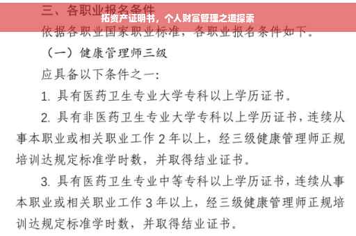 拓资产证明书在个人财富管理过程中扮演着重要的角色,通过制定明确的财务目标、合理配置资产、定期评估和调整投资组合等方式,我们能更有效地管理自己的资产,实现财富的增值,在这个过程中,我们也需要关注市场动态,不断提升自己的投资能力,希望本文能助你更好地实现个人财富管理的目标。