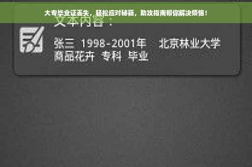 摘要:本指南为您提供了解决大专毕业证丢失问题的实用建议。面对证件丢失的困扰,不必过于焦虑,通过以下步骤轻松应对:联系原毕业学校,查询毕业证信息并获取相关证明;准备个人身份证明等必要材料,向学校申请补发证书;注意保管好个人证件,避免再次遗失。本指南助您轻松解决毕业证丢失问题,让您无忧前行。
