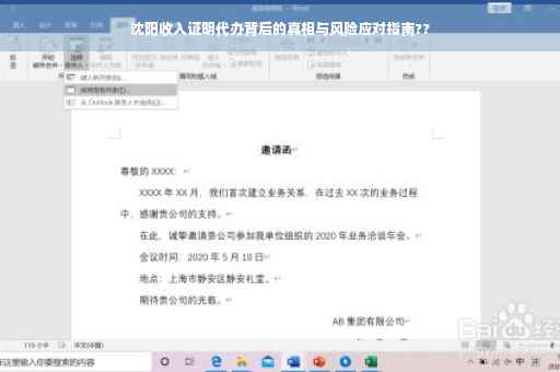 摘要:本文将探讨沈阳地区代办收入证明的现象,揭示其背后的真相以及存在的风险。文章将指出代办收入证明可能带来的虚假证明、法律风险及信用问题等隐患,并提出相应的风险应对建议,提醒公众谨慎选择代办服务,增强法律意识,保护个人信用。