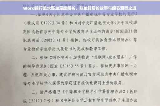 摘要:本文将揭示Word银行流水账单背后的故事与细节洞察。通过深入分析一份账单,本文将带你了解银行流水的基本构成、隐藏信息以及可能存在的疑点。阅读本文,你将能够更清晰地掌握自己的财务状况,洞察其中的故事与细节。