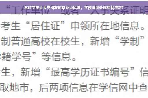 摘要:学生证丢失引发毕业证风波,学校对此采取冷漠态度。面对这种情况,学生应保持冷静,首先及时登报挂失并告知学校相关部门,同时提供其他证明文件如成绩单等作为辅助材料。若学校仍不予以重视,可考虑向上级主管部门反映情况或寻求法律援助。学生应积极采取行动维护自身权益。
