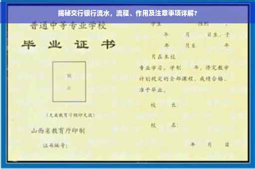 交行银行流水作为个人和企业财务记录的重要组成部分,具有广泛的应用和重要性,本文详细介绍了交行银行流水的查询流程、作用及注意事项,希望能帮助大家更好地了解和运用这一金融工具,在日常生活中,我们应关注自己的银行流水记录,合理利用和保存这些资料,以便更好地管理个人财务和应对各种需求。