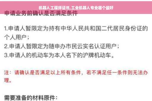 工业机器人应用工程师证书、CEAC认证、机械CE认证、ccep认证、CMA。 从事工业机器人方面的职业应该是取得维修电工,机器人操作,CAD绘图员等证书中的至少一项以上的职业资格证书。