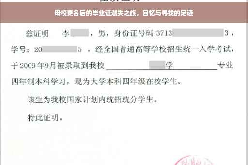 面对母校的改名和毕业证的遗失,我决定开启一段回忆与寻找的旅程,我联系了母校的老师、同学,了解母校变迁的点点滴滴,那些熟悉的面孔,让我们重温了曾经的友情,也让我感受到了温暖与力量,我在网上寻找关于毕业证补办的相关信息,经过一番努力,我终于找到了解决办法,原来,只要我们提供足够的证明,就可以向母校申请补办毕业证。