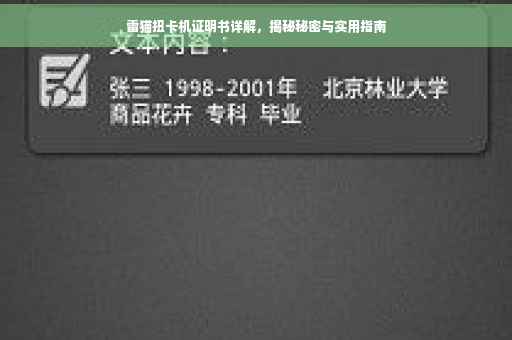 摘要:雷猫扭卡机证明书揭示了一系列隐藏的秘密和实用指南。通过深入研究和探索,该证明书提供了关于扭卡机的全面信息,包括其工作原理、使用方法和常见问题解决方案等。它还包含一些实用指南,帮助用户充分利用扭卡机的功能并提高其效率。无论是新手还是专业人士,这本证明书都是一个宝贵的资源,有助于更好地理解和使用扭卡机。