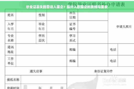关于毕业证丢失能否进入国企的问题,如果毕业证丢失,仅凭个人陈述是无法直接入职国企的。但具体能否进入国企还需结合实际情况而定。建议联系毕业院校开具相关证明或进行学历认证,同时准备好其他证明材料,以增加入职的可能性。
