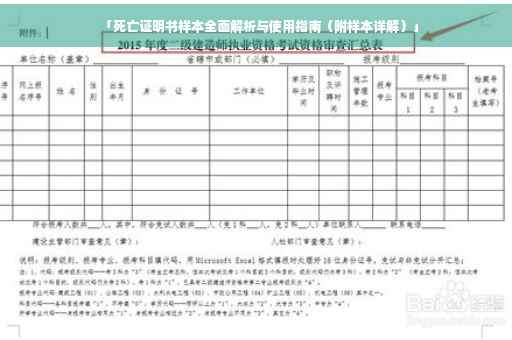 摘要:本文提供关于死亡证明书样本的全面解析及正确使用指南,包括死亡证明书的定义、作用、内容要素、填写规范等详细解析,并附具体样本供参考。帮助读者了解如何正确开具死亡证明书,以兹证明逝者身份及死亡事实,同时避免因填写不当导致的麻烦。