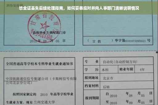 摘要:,,当毕业证丢失后,应首先前往原发证机构办理毕业证明或学历证明书。随后,向人事部门说明情况,提供补办证明、个人身份证明及相关学历材料。沟通时应诚实表述丢失原因,并表达积极态度,确保信息真实可靠。建议保留好所有相关证明材料以备查询和验证。