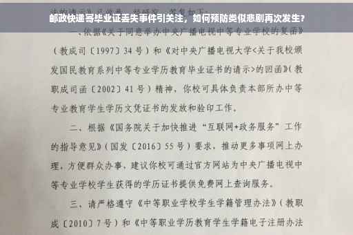 近日,邮政快递寄递毕业证丢失事件引发社会关注。为避免类似事件再次发生,应采取多项措施。快递公司应加强内部管理,提高服务质量,确保物品安全。寄件人应妥善包装并标明物品重要性,选择信誉良好的快递公司。还应建立完善的快递责任制度和赔偿机制。各方面共同努力,加强监管和防范措施,才能避免类似悲剧再次发生。