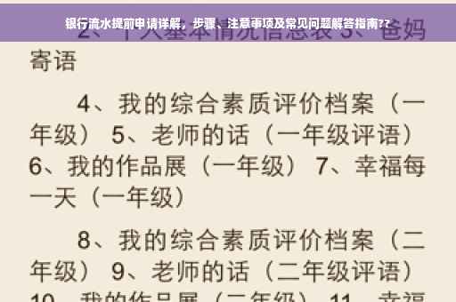 在现代社会,银行流水作为个人或企业信用评估的重要依据之一,其重要性日益凸显,无论是办理贷款、信用卡,还是其他金融业务,银行流水都是不可或缺的资料,了解如何提前申请银行流水,对于我们来说是非常必要的,本文将详细介绍银行流水提前申请的步骤、注意事项以及常见问题解答,帮助大家轻松应对。