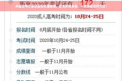 摘要:关于内蒙自考毕业证丢失问题,考生需冷静应对,及时采取行动避免影响未来。本文提供一份详尽指南,建议毕业生首先联系原颁发学校,办理毕业证明或相关证明文件。可在学信网等官方平台注册备案,确保学历信息完整可查。注意保留相关证明文件复印件,以防不时之需。此文旨在为丢失毕业证的考生提供解决方案,助力未来职业发展。