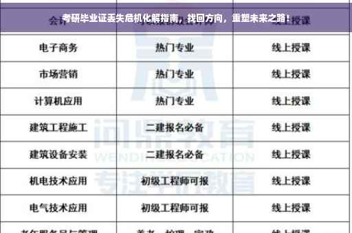 摘要:考研毕业证丢失引发危机,不必过于担心。可通过以下实用指南找回方向:立即向颁发毕业证的学校申请补办证书;咨询学校相关部门了解具体补办流程;准备相关证明材料以加快办理速度;保持耐心并关注补办进度。本指南助你重新找回方向,顺利解决毕业证丢失问题。