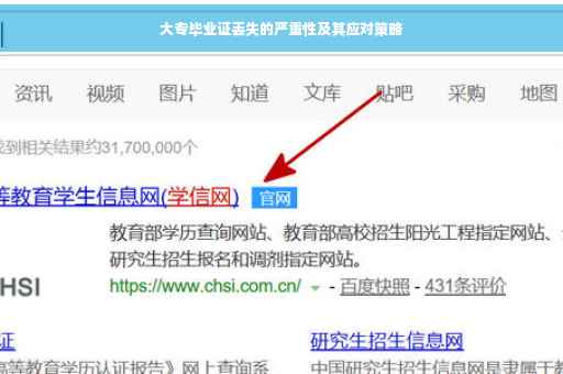 摘要:大专毕业证丢失可能带来严重后果,影响个人职业发展、学历认证等方面。为应对此问题,应采取以下措施:及时在毕业学校或教育部门办理毕业证明或学历证明,以证明学历身份;通过学校官网、学籍档案等渠道查询并打印相关证明材料,作为临时替代;加强证件管理,妥善保管毕业证,避免丢失。