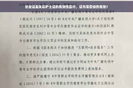 毕业证丢失后,护士证仍然有效,但为了避免不必要的麻烦,建议大家在发现毕业证丢失后,立即进行挂失和补办,保留好各类证件的复印件和电子版,以备不时之需。