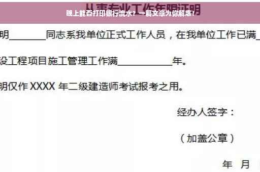随着现代生活的快节奏发展,银行业务办理的需求也日益增长,许多人在日常生活中需要打印银行流水记录,如办理贷款、核对收支等,由于银行工作时间和个人时间安排上的冲突,许多人常常疑惑晚上能否打印银行流水,本文将针对这一问题进行深入探讨,帮助大家解答疑惑。