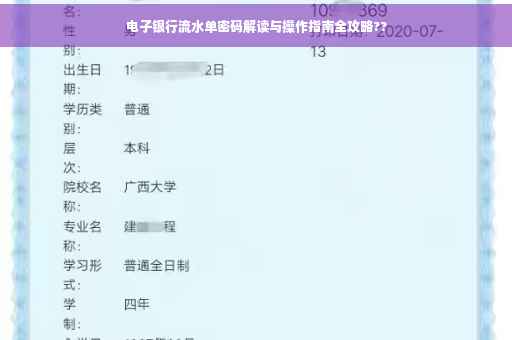 电子银行流水单密码是保护个人财产安全的重要措施,本文详细介绍了电子银行流水单的相关知识,包括密码设置、忘记处理、正确解读和应用场景等,希望读者能更好地了解和使用电子银行流水单,确保个人财产安全。