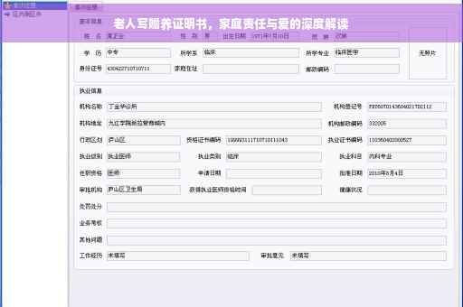 摘要:老人撰写赡养证明书,这不仅是一份家庭责任的承诺,更是对爱的深度解读。这份证明书见证了家庭成员间的相互扶持与关爱,体现了尊老爱幼的传统美德。它提醒我们,在生活的繁忙中,不应忘记对家人的关爱与责任,让家庭成为温暖的避风港。