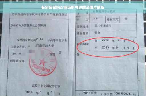 摘要:本文介绍了石家庄地区胃病诊断证明书的相关内容及其图片解析。文章详细描述了诊断证明书的外观、格式及关键信息点,包括患者姓名、性别、年龄、诊断结果、医生建议等细节。通过解析这些细节,帮助读者了解如何正确理解和使用胃病诊断证明书。文章旨在提供实用的医疗信息,帮助患者及其家属更好地了解和治疗胃部疾病。