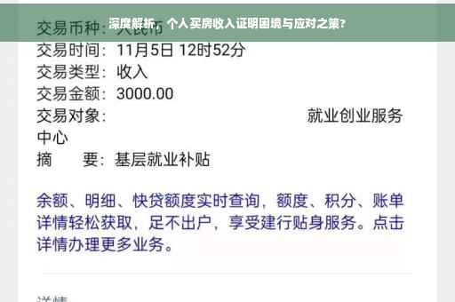摘要:个人买房收入证明办理困难,背后涉及多种困境。本文深度解析这一问题,探讨应对之道。针对无法获取收入证明的情况,建议通过其他途径证明自身经济实力,如银行流水记录等。呼吁相关部门简化购房手续,提高服务效率,共同助力解决购房难题。