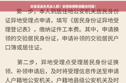 摘要:面对毕业证丢失无法入职的困境,不必过于担心。本文为你提供了一份实用指南,帮助你解决问题。及时联系毕业学校,办理毕业证明或补发证书;咨询招聘单位人事部门,了解入职所需材料,并说明情况;保留相关证明材料,如成绩单等,以备不时之需。遵循这些建议,你将能够顺利应对毕业证丢失的困扰,顺利入职。