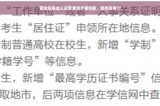 摘要:本文将详细指导您如何查询营业执照收入证明。通过简单易懂的语言,本文将一步步引导您完成操作。您需要访问相关政府网站或企业信用信息公示系统。利用营业执照注册号或统一社会信用代码进行查询。根据系统提示,获取并打印收入证明。本文旨在为您提供便捷的查询方法,让您轻松获取营业执照收入证明。