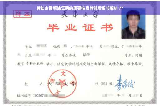 摘要:,,解除或劳动合同证明书在劳动关系中具有重要性,它涉及雇佣关系的终止及相关权益的确认。该证明书背后细节复杂,包括双方的权利和义务、合同解除或终止的原因、工作交接事项、经济补偿和福利待遇等。这些细节对于维护劳动者权益、解决劳动争议以及企业规范管理具有重要意义。在解除或劳动合同过程中,应注意相关细节,确保双方权益得到妥善保障。