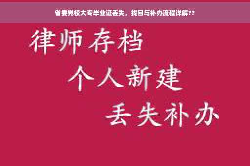 省委党校大专毕业证丢失,可按照以下流程找回与补办:,,1. 前往毕业学校或相关档案管理部门查询毕业证编号及档案。,2. 在学校官网下载或领取补办毕业证的申请表,填写个人信息及原因。,3. 准备相关证件原件和复印件,如身份证、学历证书等。,4. 提交申请至学校教务处或指定部门,并缴纳相应费用。,5. 等待审核及办理,领取补办后的毕业证。,,具体流程可能因学校而异,建议咨询学校相关部门了解详细信息。