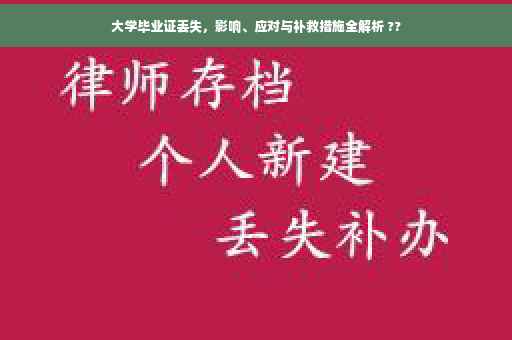 摘要:大学毕业证丢失可能带来就业、升学、身份认证等方面的影响。面对此情况,应保持冷静,及时采取措施。可联系毕业学校,查询毕业证书编号及颁发机构,开具相关证明。进行登报声明,避免证书被非法利用。备份电子版证书、保留相关学籍资料等也是有效的预防措施。丢失毕业证虽带来不便,但正确应对和补救,可最小化损失。