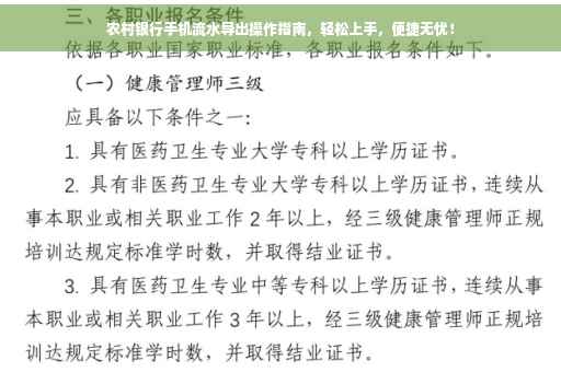 本文详细介绍了农村银行手机导出流水的步骤和注意事项,希望能够帮助广大用户轻松完成操作,在操作过程中,如遇任何问题,请及时联系农村银行客服寻求帮助,建议用户定期查看银行流水,确保账户安全。