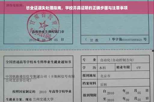 摘要:针对毕业证遗失问题,学校开具证明是重要操作。正确做法包括联系学校教务处,提交相关证明材料,如身份证、学历信息等,并按流程申请开具证明。在此过程中,注意事项包括确保提交材料真实有效,遵守学校规定的时间限制,以及留意证明的具体格式和措辞。此证明关乎个人学历认证,务必谨慎处理。
