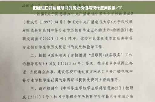 旧版进口货物证明书作为历史与现代交融的载体,具有重要的历史价值与现代应用,它们不仅是文化遗产的重要组成部分,还为学术研究、法律诉讼、企业文化展示以及教育教学等领域提供了宝贵的资源,我们应该充分认识和珍视旧版进口货物证明书,让它们在现代社会中发挥更大的作用。