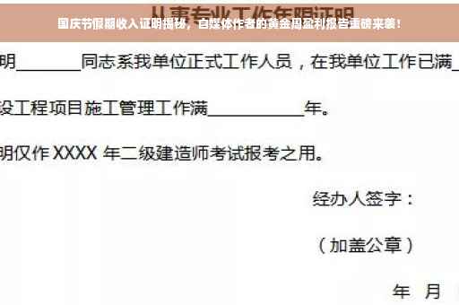 随着网络时代的蓬勃发展,自媒体行业日益壮大,越来越多的人投身于自媒体创作,国庆节假期,对于自媒体作者而言,既是休息调整的时刻,也是抓住热点、提升内容影响力、实现盈利的重要时期,本文将围绕国庆节假期的收入证明这一主题,带领大家了解自媒体作者在黄金周内的盈利情况。