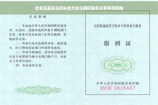 摘要:毕业证丢失且钢印缺失,需及时采取措施进行补救。补救方法包括联系原颁发学校补发钢印并开具证明,或提供相关证明材料如档案中的毕业证明等。在补救过程中,需注意保留相关证明材料,确保信息的真实性和完整性。应尽早行动,避免影响就业、升学等事务。面对毕业证丢失问题,及时补救并谨慎处理相关事宜至关重要。