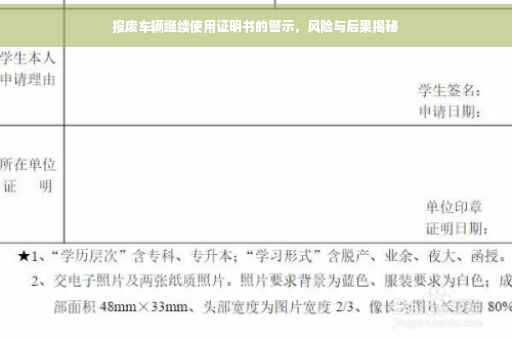 随着社会的快速发展,汽车已成为人们日常生活中不可或缺的交通工具,随着车辆使用年限的增长,一些车辆逐渐达到报废标准,对于报废车辆,国家有明确的法律法规进行管理和规定,严禁继续使用报废车辆上路,在某些情况下,一些车主可能会选择忽视法规,继续使用报废车辆,本文将围绕报废车辆继续使用证明书这一主题,探讨其背后的风险与后果,以提醒广大车主遵守法规,保障自身及他人安全。