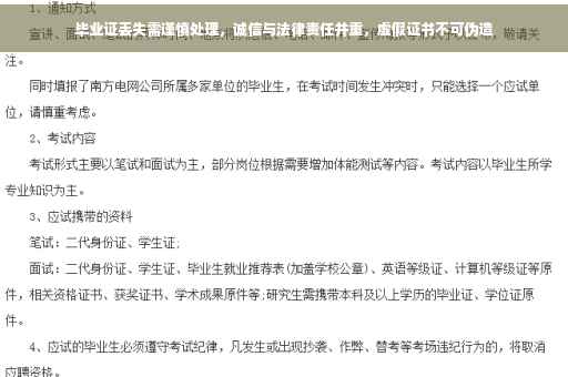 摘要:毕业证丢失后不可伪造虚假证书,这不仅违背了诚信原则,也涉及法律责任。个人应重视证书保管,一旦丢失,应通过正规途径进行补办。伪造证书可能导致严重后果,包括法律追究和个人信誉受损。诚信与法律责任并重,应始终贯穿于个人行为中。