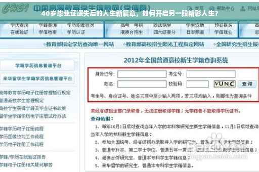 40岁,面临毕业证丢失的困境,人生的另一篇章如何翻开新的一页?面对挑战,不必气馁,重拾信心是关键。尽管失去一纸证书,但经验和能力仍在。可借助网络寻找相关证明,更新简历,积极求职。继续学习,提升自我,开启新的人生旅程。生活不止眼前的苟且,勇敢迎接未来的挑战,书写人生的新篇章。
